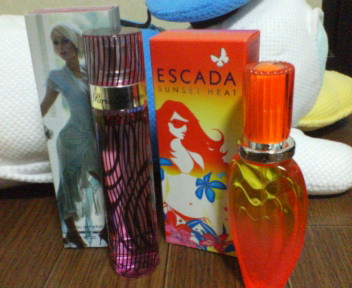 近頃睡眠が細切れでヒマがあれば眠りこけてます(-_-)zzz なんでこんなに寝たり起きたりを繰り返しているんだろか。…これ暇人じゃなきゃできないよね(^^;) 欲しい物ランキン第3位の香水をゲト! エスカーダのサンセットヒートです。(写真右)南国~なジューシーな香り(*´∀`*) こーいうおいしそうな香り大好きです。 今までパリスヒルトンシアーを愛用してたけど、最近カジュアルなカッコばっかだしエスカーダ超使いそう。 パリスはトップノートがりんごだから好きなんだよねー。(sukeさんあたしもりんごの香り超好きです。) バトンキャッチありがとうございます!\(*^▽^*)/ そして拍手も本当にありがとうございます! ひさびさにPC触ってなんだか人の優しさに触れた気がしました。嬉しいなぁv