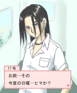 いっつも暇なんで気が向いたらどんなバトンでもまわしてやってくだせえ! …あれ?バトンの名前がわからない…ま、いいやー お題『Gガン』でいってみよー! ●あなたは何人兄弟(もしくは姉妹)の何番目ですか? ひとりっこやよー 種違い(言い方がやだ笑)で10コ以上はなれたおにいちゃんおねーちゃんがおるけど、なんせ会わないからな~ ●兄弟・姉妹だったらいいとおもうGガンキャラは誰ですか? そらもうキョウジ兄さんがおにいちゃんならいいよね!ブラコン街道まっしぐらだよ!笑 ハンス(セシルのおにいちゃん)もポイント高し。 弟はやっぱサイシーだよね~他の弟っぽいキャラ見当たらないな。 お姉ちゃんはやっぱレインだよ。すげー優しいだろーなーいいなー 妹はセシルかマリアルイゼ。 ●お父さん・お母さんだったらいいと思うGガンキャラは誰ですか? お父さんはライゾウ・カッシュ博士だなー。どうでもいいけどキョウジ兄さんってすごくお父さん似だよね。そう思わない? 間違っても東方不敗だなんて言わない(笑)あんなに馬鹿馬鹿言われたくない。 お母さんかーやっぱカッシュ夫人になっちゃうかなーどんな人か知らないけど優しそうな顔だもんねー 恵雲と瑞山が親代わりでもいいね。何かにつけてよよよ…って泣かれちゃうよきっと! ●恋人にしたいGガンキャラは誰ですか? キョキョキョキョウジ兄さん! ジョルジュもいいな~ ●結婚するならこの人というGガンキャラは誰ですか? それだとジョルジュかしら?いやもちろんキョウジ兄さんが一番好きだけど!笑 ●親友にしたいGガンキャラは誰ですか? 親友か~うーんみんなキャラ濃いーからなー; チボデーギャルズと仲良くなったら楽しそうだよね。 アレンビーでもいいんだけどあたし体力無いからなー ●このバトンを回す人を上げてください(人数は任意で) いっつも同じ方にしか回せてないので今回はアンカーで! でへー楽しかったです^^ 今ねーめっちゃハマってるゲームがあるのよ~ 明日オロチ出るけど…オロチよりこれやってそうだなーもちろんオロチも楽しみ! プロモの兼続かっこいいけどなんか笑っちゃうよ!あたしの中では兼続=おかしい奴だからな。 そんなわけで近いうちにまた17号落書きして今ハマってるゲームの事でも書きにきまーす^^ 拍手ありがとうございます!本当に嬉しいです!ヤル気でます! どうぞこれからも見捨てないでやってくださいね;